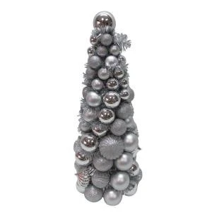 - Tree-shaped silver ball tabletop decoration measures 18 in. H x 7-1/4 in. W