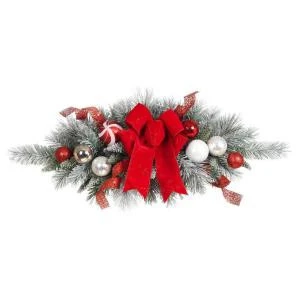 Home Accents Holiday 32 in. Flocked Pine Swag with Red and White Ball and Velvet Bow-2321300HD – Description